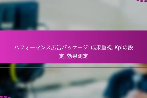 パフォーマンス広告パッケージは、広告の効果を最大化するために成果重視のアプローチを採用しています。KPIを設定し、具体的な数値目標を設けることで、広告のパフォーマンスを測定・最適化しやすくなります。効果測定を通じて、広告キャンペーンの成果を明確に評価することが可能です。 パフォーマンス広告パッケージとは何か? パフォーマンス広告パッケージは、広告の効果を最大化するために設計された戦略的な広告手法です。具体的には、成果に基づく指標を設定し、広告のパフォーマンスを測定・最適化することを目的としています。 定義と目的 パフォーマンス広告パッケージは、広告主が明確な成果を追求するためのフレームワークです。このアプローチでは、広告の効果を具体的なKPI(重要業績評価指標)に基づいて評価し、ROI(投資対効果)を最大化することを目指します。 目的は、広告活動が実際にどの程度の成果を上げているかを把握し、必要に応じて戦略を調整することです。これにより、無駄なコストを削減し、効率的な広告運用が可能になります。 主要なコンポーネント パフォーマンス広告パッケージの主要なコンポーネントには、ターゲット設定、広告クリエイティブ、KPIの設定、効果測定が含まれます。これらの要素は、広告の成功を左右する重要な要素です。 特に、ターゲット市場に適した広告クリエイティブを作成することが、効果的な成果を得るためには不可欠です。また、KPIの設定により、広告のパフォーマンスを定量的に評価できます。 ターゲット市場の特定 ターゲット市場の特定は、パフォーマンス広告の成功において非常に重要です。市場調査やデータ分析を通じて、広告の対象となる顧客層を明確にする必要があります。 具体的には、年齢、性別、地域、興味などの要素を考慮し、ターゲットを絞り込むことで、広告の効果を高めることができます。適切なターゲティングにより、広告費用の無駄を減少させることが可能です。 成果重視のアプローチ 成果重視のアプローチでは、広告の効果を具体的な成果に結びつけることが求められます。これには、コンバージョン率や顧客獲得コストなどの指標を用います。 このアプローチを採用することで、広告主は投資対効果を明確に把握でき、より効果的な広告戦略を構築することができます。例えば、特定のキャンペーンがどの程度の売上を上げたかを分析することが重要です。 KPIの重要性 KPIは、パフォーマンス広告パッケージにおいて成果を測定するための指標です。適切なKPIを設定することで、広告の効果を定量的に評価し、戦略を改善するための基盤を築けます。 一般的なKPIには、クリック率、コンバージョン率、顧客獲得コストなどがあります。これらの指標を定期的にモニタリングし、必要に応じて戦略を調整することで、広告のパフォーマンスを向上させることが可能です。 どのようにKPIを設定するか? KPIを設定する際は、目標に直結する指標を選ぶことが重要です。具体的な数値目標を設定することで、パフォーマンスを測定しやすくなります。 KPIの種類と選定基準 KPIには、定量的指標と定性的指標があります。定量的指標は数値で測定できるもので、売上やコンバージョン率が含まれます。一方、定性的指標は顧客満足度やブランド認知度など、数値化が難しいものです。 KPIを選定する際は、目標に関連する指標を選ぶことが重要です。ビジネスの目的や戦略に合致した指標を設定することで、効果的な結果を得られます。 SMART基準に基づく設定 KPIを設定する際は、SMART基準を活用すると効果的です。SMARTとは、Specific(具体的)、Measurable(測定可能)、Achievable(達成可能)、Relevant(関連性)、Time-bound(期限付き)の頭文字を取ったものです。 例えば、「今四半期中に売上を10%増加させる」という目標は、SMART基準に基づいています。このように具体的かつ測定可能な目標を設定することで、進捗を追跡しやすくなります。 業界別のKPI例 業界によって適切なKPIは異なります。例えば、eコマースではコンバージョン率やカート放棄率が重要な指標です。一方、サービス業では顧客満足度やリピート率が重視されます。 具体的な例として、旅行業界では予約数や顧客のレビュー評価がKPIとして使われることが多いです。業界特有の指標を理解し、それに基づいてKPIを設定することが成功の鍵です。 目標達成のためのKPI調整 KPIは設定後も定期的に見直し、必要に応じて調整することが重要です。市場環境やビジネスの状況が変化するため、柔軟に対応する必要があります。 例えば、目標達成が難しい場合は、KPIの数値を再評価し、現実的な範囲に修正することが求められます。また、達成した場合は、次の目標を設定してさらなる成長を目指すことが重要です。 効果測定の方法は? 効果測定は、広告キャンペーンの成果を評価するためのプロセスです。適切な指標を選定し、データを収集・分析することで、広告の効果を明確に把